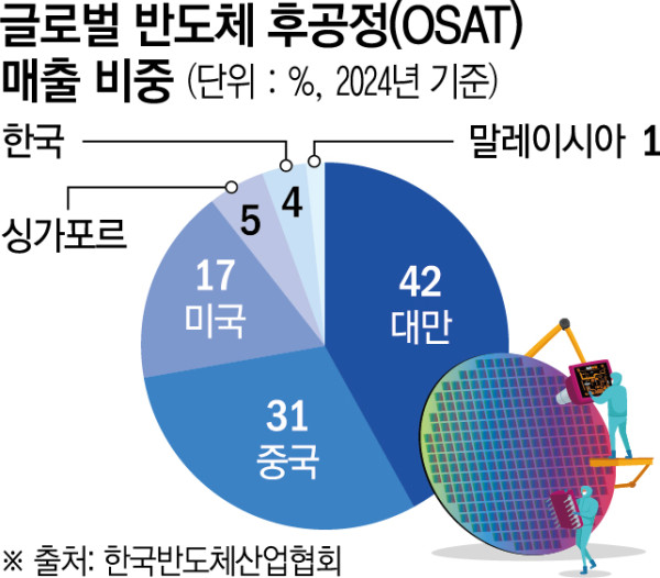 후공정 분야에서도 국내 기업들은 갈 길이 멀다. 한국반도체산업협회에 따르면 2024년 기준 글로벌 반도체 후공정(OSAT) 기업 매출 비중은 대만이 42%로 가장 높고, 중국 31%, 미국 17%가 뒤를 잇는다. 이들 3개국이 전체 시장의 약 90%를 차지하는 구조다. 한국은 싱가포르에 이어 4% 수준으로, 아직 존재감이 크지 않다. 국내 팹 투자가 확대되고 있음에도 후공정과 장비 분야에서 국산 비중이 제한적인 이유다.