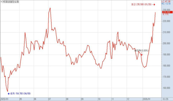 문제는 비용이다. HS효성첨단소재는 1월 들어 외국인 매수세가 유입되며 오름세를 보였고 26일에는 장중 23만 원대를 회복하며 52주 신고가를 경신했다. 이날 거래소 종가인 22만8000원을 기준으로 계산하면 남은 지분 매입에 약 160억 원이 필요하다. 만약 주가 반등 이전인 17만 원 후반대에서 매입을 완료했다면 약 125억 원이면 충분했을 금액이다. 결과적으로 주가 상승으로 인해 지주사 요건 충족을 위해 수십억 원의 비용을 더 내야 하는 상황에 처한 셈이다.
