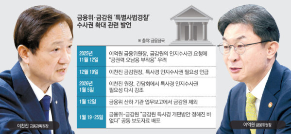 금융위원회와 금융감독원 간 권한 갈등이 ‘특별사법경찰(특사경) 인지수사권’ 논의를 계기로 전면화하고 있다. 조직 개편과 감독 체계 전반을 둘러싼 이견이 누적돼 온 가운데, 특사경의 권한 범위와 통제 주체를 둘러싼 공방이 양 기관의 역할 분담과 주도권 문제를 가장 선명하게 드러내는 쟁점으로 부상했다.