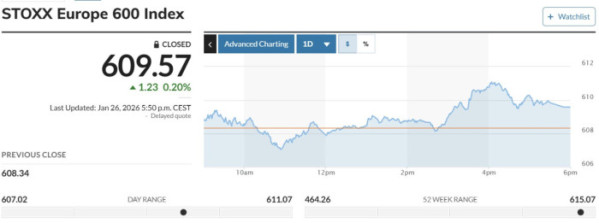 ▲스톡스유럽600지수 26일(현지시간) 609.57. (마켓워치)