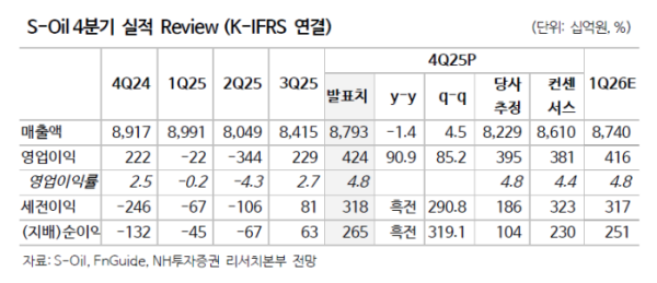 최영광 연구원은 "윤활 부문은 원재료 가격 하락으로 스프레드가 크게 개선되며 호실적 기록했다"며 "2026년 1분기 영업이익은 4161억원(영업이익률 4.8%) 예상한다"고 설명했다.