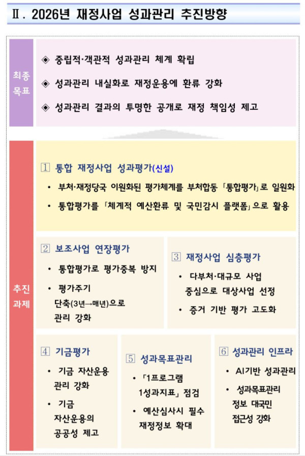 기획예산처는 27일 2026년 재정사업 성과관리 추진계획을 수립하고, 재정 운용 전반에 성과 중심 관리 체계를 본격 적용한다고 밝혔다. 국가재정법 개정에 따라 5년 단위 성과관리 기본계획과 연도별 추진계획 수립이 의무화된 데 따른 조치다.
