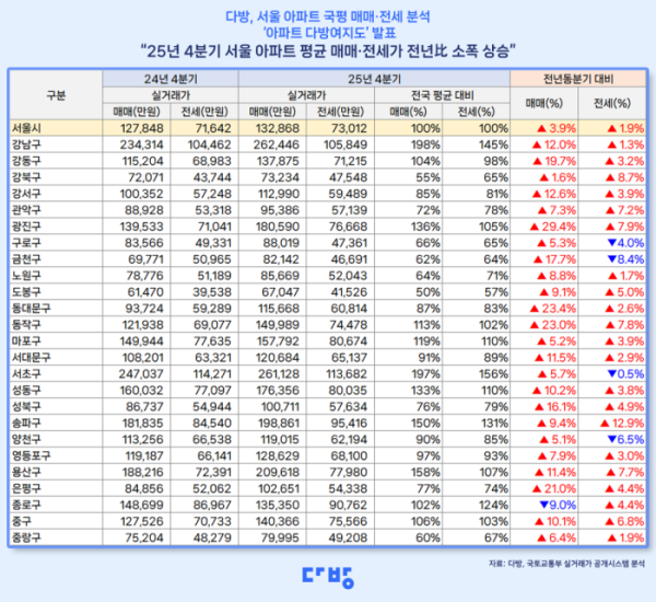 27일 부동산 정보 플랫폼 ‘다방’이 전용 84㎡ 아파트의 평균 매매가와 전세 보증금 수준을 분석해 발표한 2025년 4분기 기준 ‘아파트 다방여지도’에 따르면 서울 지역 아파트 전용 84㎡의 평균 매매가는 13억2868만 원, 평균 전세 보증금은 7억3012만 원으로 나타났다. 이는 2024년 4분기 대비 각각 5020만 원(3.9%), 1370만 원(1.9%) 증가한 수치다.