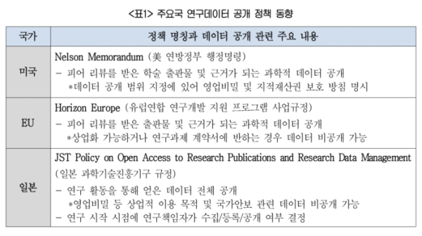 건의서는 “미국과 유럽연합(EU), 일본의 국가 연구개발 데이터 공개 규정을 보면, 연구데이터 공개 대상이 논문 등 학술 출판물 중심이거나 상업적 활용 또는 연구책임자의 결정에 따라 비공개가 가능하도록 설계돼 있다”고 지적했다.