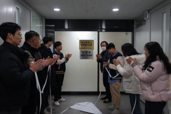 ▲용인특례시공무원노동조합 관계자들이 26일 '조합원 갑질신고센터' 개소식에서 현판 제막 후 박수를 치고 있다. (용인특례시공무원노동조합)