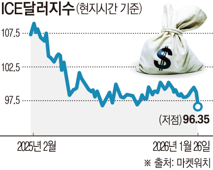 26일(현지시간) 파이낸셜타임스(FT)에 따르면 ICE선물거래소에서 유로화 등 주요 6개 통화에 대한 달러화 가치를 나타내는 달러인덱스(DXY)는 장중 한때 96.35까지 떨어지면서 4개월 만의 최저치를 기록했다. 반면 엔·달러 환율은 한때 최대 1.6% 하락한 153.3엔까지 떨어지면서 엔화 가치가 뚜렷한 강세를 나타냈다.
