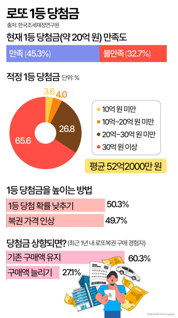 한국조세재정연구원이 지난해 만 19~34세 남녀 5000명을 대상으로 온라인 조사를 한 결과 현재 약 20억 원인 로또복권 1등 당첨금에 만족하다고 답한 비율은 45.3%였다. 불만족하다는 32.7%였다.