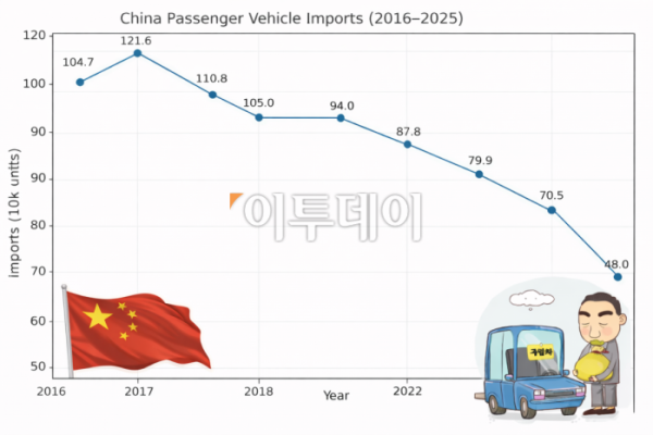 같은날 일본 니혼게이자이신문(닛케이)도 중국발 특파원 보도를 통해 "중국의 작년 자동차 수입량이 42만대 수준이던 2009년 이후 16년 만에 가장 적었다"고 전했다. 중국의 자동차 수입 규모는 2014년 약 143만 대로 정점을 찍은 뒤 점차 감소했다. 2024년에는 연간 70만 대 수준까지 감소했다가 지난해에는 50만 대에도 미치지 못했다.
