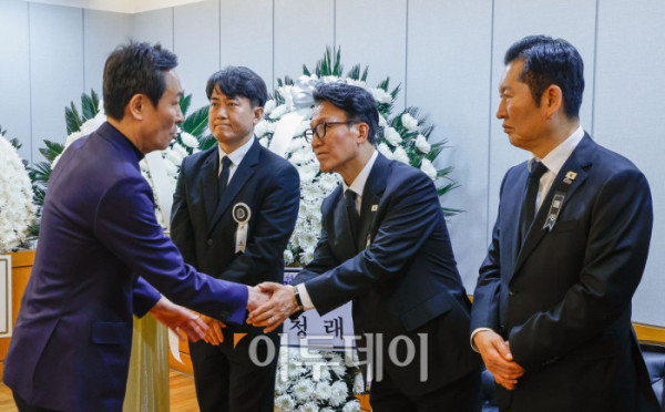 ▲이인영 더불어민주당 의원이 27일 오후 서울 종로구 서울대학교병원 장례식장에 마련된 고 이해찬 민주평화통일자문회의 수석부의장의 빈소를 찾아 조문하며 정청래 더불어민주당 대표를 위로하고 있다. <2026.1.27 사진공동취재단>
