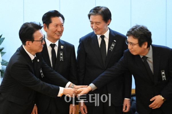 ▲김민석 국무총리(왼쪽 첫번째)가 27일 서울 종로구 서울대학교병원 장례식장에 마련된 이해찬 민주평화통일자문회의 수석부의장의 빈소에서 정청래 더불어민주당 대표(왼쪽 두번째), 조국 조국혁신당 대표(오른쪽 두번째), 유시민 작가(오른쪽 첫번째)와 대화하고 있다. 2026.1.27 사진공동취재단