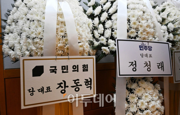 ▲27일 서울 종로구 서울대학교병원 장례식장에 마련된 이해찬 민주평화통일자문회의 수석부의장의 빈소에 장동혁 국민의힘 대표, 정청래 더불어민주당 대표 근조화환이 놓여있다. 2026.1.27 사진공동취재단