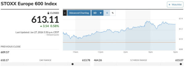 ▲스톡스유럽600지수 27일(현지시간) 613.11. (마켓워치)