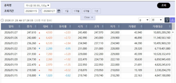 미니금(99.99·100g) 가격은 27일 기준 1g당 24만7610원에 거래를 마쳤다. 이는 15일(21만8800원) 대비 약 열흘 만에 13% 가까이 오른 수준이다. 해당 기간 하루를 제외하고는 대부분 상승 마감하며 가파른 오름세를 보였다.