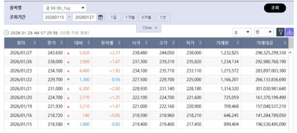 이 같은 글로벌 흐름은 국내 금시장에도 즉각 반영됐다. 27일 종가 기준 금 99.99(1kg) 종가는 1g당 24만3650원으로 집계됐다. 이는 이달 15일 종가(21만8580원) 대비 약 2만5000원 이상 오른 수준이다. 불과 열흘 남짓한 기간 동안 두 자릿수 상승률을 기록했다.