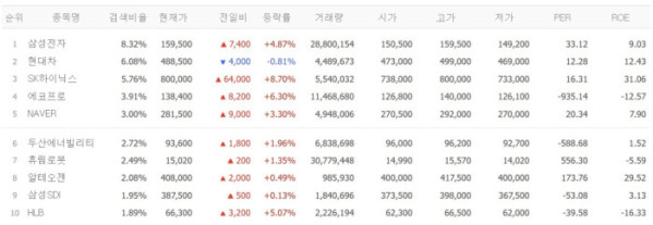 28일 금융투자업계에 따르면 장 시작 전 네이버페이증권 검색상위 종목은 삼성전자, 현대차, SK하이닉스, 에코프로, 네이버(NAVER) 등이다.