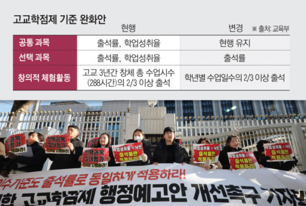 이번 대책에 따라 공통과목은 현행처럼 출석률과 학업성취율 기준을 유지하되, 선택과목은 출석률만 충족하면 학점을 이수한 것으로 인정한다. 창의적 체험활동 역시 기존 ‘고교 3년간 총 수업시수의 3분의 2 이상 출석’에서 ‘학년별 수업일수의 3분의 2 이상 출석’으로 기준이 완화된다.