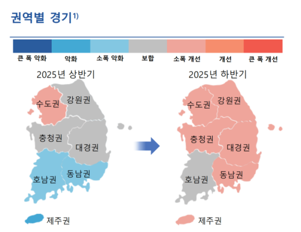 반면 호남권의 경우 상반기 소폭 하락에 이어 하반기에도 석유화학과 철강 등의 부진이 이어지며 보합세에 머물렀다. 다만 하반기 들어서는 도소매업과 운수업 등 서비스업이 회복세를 나타내며 부진이 일부 완화되는 모습을 보였다. 정 팀장은 "각 권역별 주력사업들이 다르기 때문에 그에 따른 경기도 차등화되는 측면이 있다"면서 "호남권은 산업이 석유화학과 철강, 조선, 자동차, 석유정제에 집중돼 있는데 석유화학과 철강은 꾸준히 업황이 좋지 않고 자동차와 건설업 역시 생산이 감소하거나 부진한 모습을 보였다"고 밝혔다.