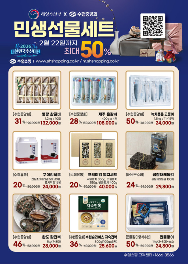 이와 함께 수협 온·오프라인 매장과 카카오톡 선물하기, 네이버플러스스토어 등에서는 설맞이 수산물 민생선물세트를 최대 50% 할인된 가격으로 판매한다. 참조기, 갈치, 전복, 김, 멸치 등 명절 수요가 높은 품목을 중심으로 구성했다.
