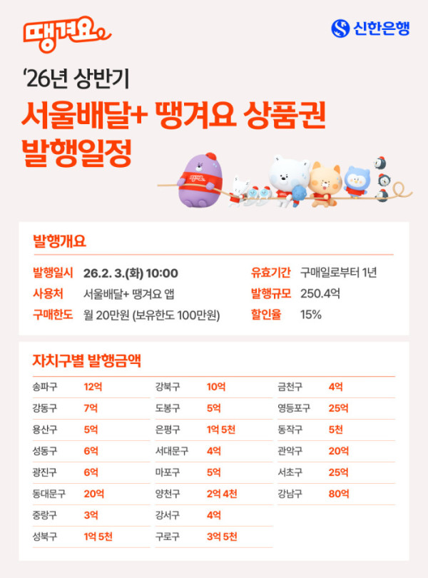 신한은행은 서울시와 함께 250억 원 규모의 땡겨요 전용상품권을 발행한다고 28일 밝혔다. 이번 상품권은 다음 달 3일 오전 10시부터 서울시 22개 자치구에서 순차적으로 발행되며 서울시 공공배달 애플리케이션(앱) ‘땡겨요’에서만 사용할 수 있다. 상품권 구매 시 15% 할인 혜택이 적용된다.