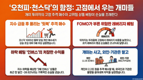 코스피 5000선 돌파와 코스닥 1000선 안착이라는 역사적 '불장'이 연출되고 있지만, 개인 투자자들의 계좌 수익률은 오히려 뒷걸음질 치고 있다. 지수가 이미 오를 대로 오른 고점에서 뒤늦게 뛰어드는 '추격 매수'와 고위험 상품에 대한 과도한 베팅이 개인들의 손실을 키우고 있다는 지적이 나온다.