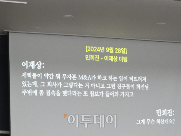 김 변호사는 "2024년 8월 민 전 대표 해임과 매니지먼트 계약위반을 이유로 한 뉴진스 멤버들의 전속계약해지 통보 이후, 같은 해 12월 한 매체가 '2024년 9월 30일 다보링크 실질적 소유자라고 하는 박정규와 민희진이 만났다'는 취지의 이른바 '탬퍼링' 논란을 보도했다. 이후 하이브와 민 대표의 주주간 분쟁은 '민희진의 뉴진스 템퍼링' 문제로 급격히 전환됐다"고 말했다.