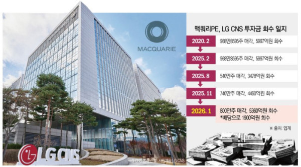 결과적으로 맥쿼리는 이번 투자를 통해 ‘대박’ 수준의 성과를 거둔 것으로 평가된다. 맥쿼리는 초기 투자금 1조19억 원을 투입해 블록딜을 통해 약 1조3298억 원을 회수했고, 투자 기간 동안 약 1900억 원 규모의 배당도 수령한 것으로 추정된다. LG CNS는 맥쿼리에게 배당으로 △2021년 260억 원 △2022년 333억 원 △2023년 363억 원 △2024년 464억 원 △2025년 510억 원을 지급했다. 여기에 지난해 2월 LG CNS 상장 당시 구주 매각으로 회수한 5997억 원까지 포함하면 총 회수금액은 약 2조1195억 원에 달한다. IB 업계 관계자는 “맥쿼리의 LG CNS 투자는 재무적 투자자(FI)로서의 역할에 충실하며, 시장 상황에 맞춰 회수 시점을 정교하게 조율한 사례”라고 설명했다.