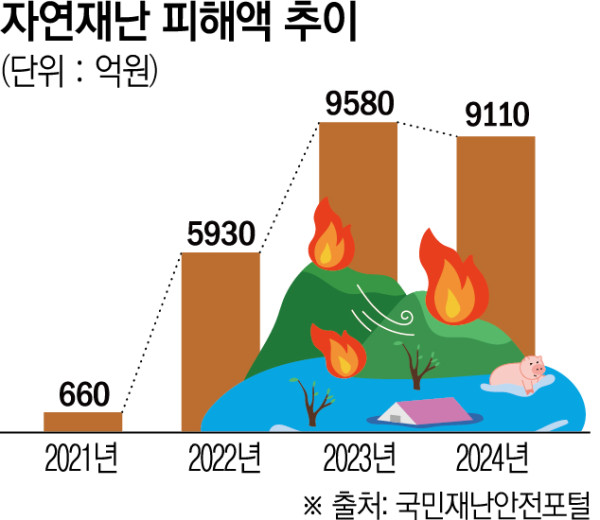 28일 보험업계에 따르면 기후 리스크의 불확실성은 기존 예측 범위를 벗어나 구조적 위험 단계로 진입하고 있다. 보험연구원(KIRI)이 이달 초 발간한 ‘기후·재해리스크와 보험산업의 과제’에 따르면 2024년 국내 자연재난 피해액은 9111억 원으로 집계돼 증가세를 보였다. 보고서는 “리스크의 심도와 빈도가 커지면서 보험사가 감당해야 할 손실 총량이 구조적으로 팽창하고 있다”고 진단했다.