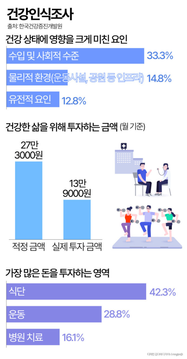 건강한 삶을 위해 투자하는 적정 금액은 한 달 평균 27만3000원이라고 생각했으나, 실제 투자 금액은 한 달 평균 13만9000원이었다.