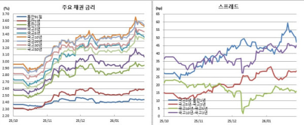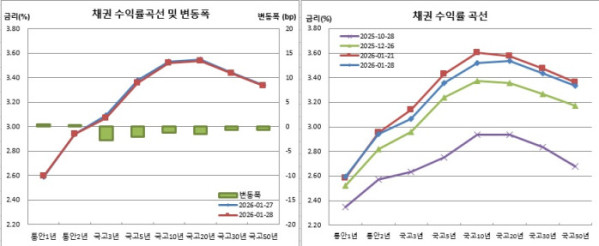 반면 국고3년물은 2.7bp 하락한 3.067%를, 국고10년물은 1.2bp 떨어진 3.536%를 보였다. 국고30년물 또한 0.6bp 내린 3.437%를 나타냈다.