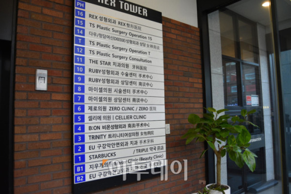 루비성형외과가 위치한 도산대로 렉스타워는 건물 전체가 커다란 미용의료 복합 센터를 방불케 했다. 1층의 카페와 약국을 제외한 모든 층이 치과, 성형외과, 미용 시술이 주요한 일반의원으로 들어 찼다. 각 층마다 병기된 영어와 한자가 외국인 환자들의 비중을 방증했다. 취재에 앞서 들른 옆 건물 다이소에서는 코와 눈에 거즈를 붙인 중국인 관광객들이 화장품 코너를 구경하고 있었다.