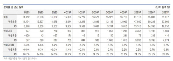 김 연구원은 “상반기 중 미국 AS 부품 판가에 대한 인상이 발생할 경우 하반기 AS 부문 OPM 상승폭이 확대 가능하다”며 “부품모듈 사업 또한 1~3분기 변동비 및 간세로 인해 적자가 발생할 수 있으나 4분기 회수하며 연간 영업이익률 0.7%를 예상한다”고 전망했다.