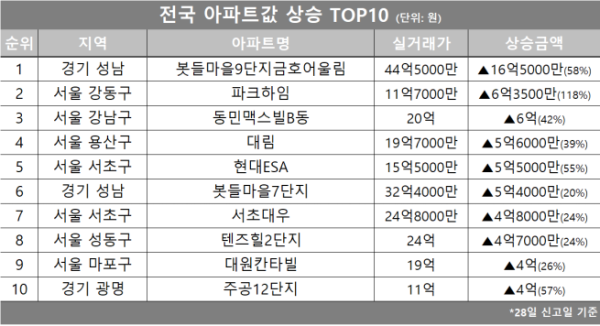 이 밖에도 경기 성남시 ‘봇들마을7단지’, 서울 서초구 ‘서초대우’, 성동구 ‘텐즈힐2단지’, 마포구 ‘대원칸타빌’, 경기 광명시 ‘주공12단지’ 등이 전국 아파트값 상승 상위 10위권에 포함됐다.
