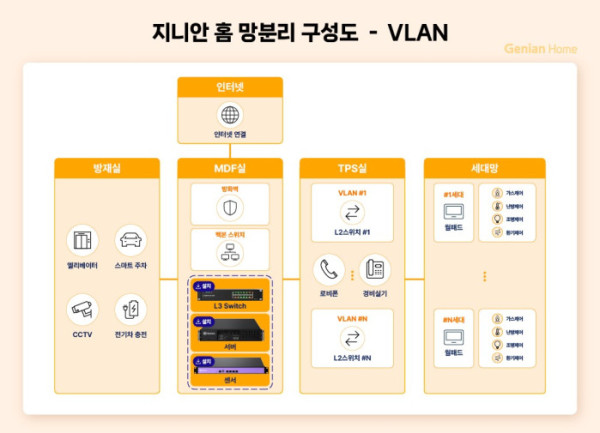지니안 홈의 ‘VLAN’은 세대별로 독립적인 VLAN 환경에 네트워크 접근제어 기술을 결합했다. 홈네트워크 필수 서비스를 제외한 세대 간 통신을 원천적으로 차단하고 비인가 단말의 네트워크 접속을 통제한다. 홈네트워크 운영에 필요한 필수 서비스 중심으로 보안 정책을 설계할 수 있어, 보안성과 운영 편의성을 동시에 고려했다.