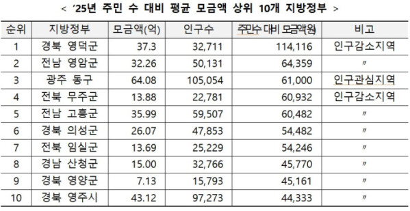 89개 인구감소지역의 평균 모금액은 7억6000만 원으로 기타 지역(평균 4억5000만 원)의 1.7배 수준이었다. 지역별 주민 수를 기준으로 모금액 규모를 분석한 결과, 수도권(1인당 평균 432원) 대비 비수도권(1인당 평균 5165원)이 12배가량 높았다. 인구가 3만 명대에 불과한 경북 영덕군은 1인당 평균 모금액이 11만 원을 웃돌았다.