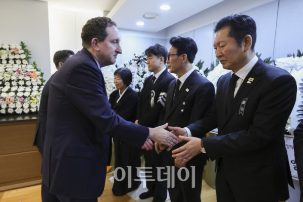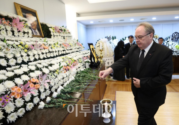 ▲제프 로빈슨 주한호주대사가 29일 서울 종로구 서울대학교병원 장례식장에 마련된 고 이해찬 전 국무총리의 빈소에서 조문을 하고 있다. 조현호 기자 hyunho@