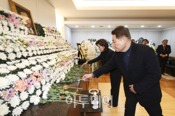 ▲유재성 경찰청장 직무대행이 29일 서울 종로구 서울대학교병원 장례식장에 마련된 고 이해찬 전 국무총리의 빈소에서 조문을 하고 있다. 조현호 기자 hyunho@