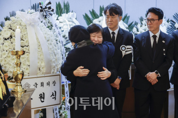 ▲29일 서울 종로구 서울대학교병원 장례식장에 마련된 고 이해찬 전 국무총리의 빈소에서 한 조문객이 조문한 뒤 이 전 총리의 부인인 김정옥 여사를 위로하고 있다. 조현호 기자 hyunho@