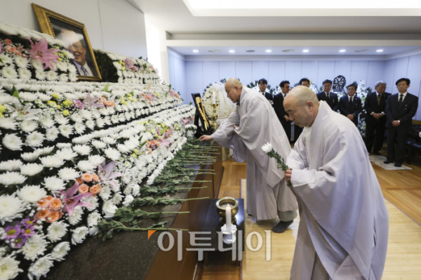 ▲천태종 감사원장인 용구스님(오른쪽 두 번째)이 29일 서울 종로구 서울대학교병원 장례식장에 마련된 고 이해찬 전 국무총리의 빈소에서 조문을 하고 있다. 조현호 기자 hyunho@