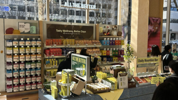 29일 찾은 올리브베러 1호점은 직장인 유동 인구가 많은 서울 종로구 광화문 디타워 1층에 들어서 오가는 행인들의 시선을 사로잡았다. 올리브영은 오피스 상권이면서 풍부한 웰니스 인프라, 다양한 식문화 환경 등을 고려해 이곳을 1호점으로 낙점했다. 430㎡(약 130평) 규모의 복층 매장으로 500여 개 브랜드, 3000여 종의 웰니스 상품으로 채웠다.