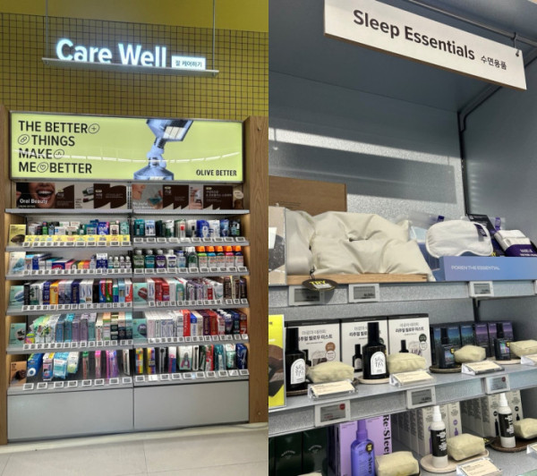하루를 마무리하는 시점에서는 휴식과 회복에 집중한다. ‘잘 가꾸기’존은 향과 헤어·바디 상품이 주를 이룬다. 향은 올리브영의 향수 카테고리와는 다르게 스트레스 관리 등에 도움을 주는 아로마 중심이다. 헤어·바디는 더모 코스메틱 위주로 꾸려 올리브영 상품군과 겹치는 부분이 있었다. ‘잘 쉬기’는 홈웨어, 안대, 필로우미스트 등 수면용품과 허브티 등으로 꾸렸다. 매장 한편에 오설록 코너에서는 즉석에서 차(茶)를 마셔볼 수 있다.