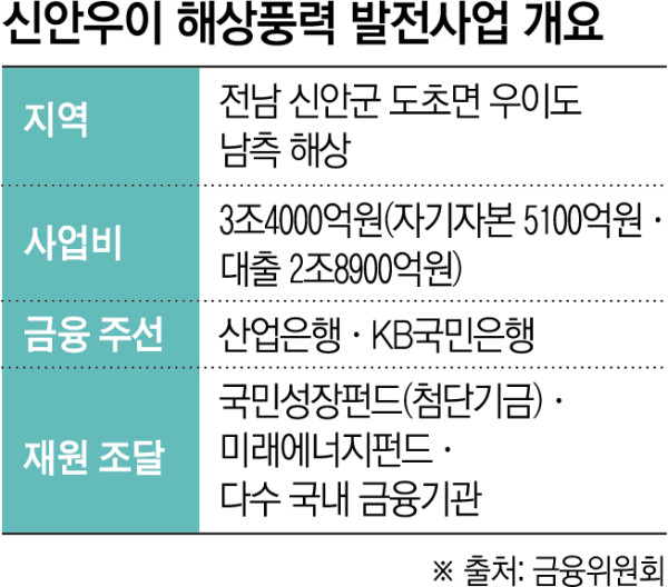 산업은행과 KB·신한·하나·우리·NH농협은행 등 은행권이 공동 조성한 미래에너지펀드가 신안우이 프로젝트에 총 5440억 원을 지원한다. 구체적으로 2040억 원은 출자, 3400억 원은 후순위 대출로 지원된다. 펀드 출범 이후 첫 금융지원 사례로 재생에너지 프로젝트를 둘러싼 민관 협력이 본격화됐다는 점에서 상징성이 크다는 평가다.