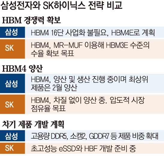 반면 SK하이닉스는 HBM3E에 이어 HBM4에도 1b(10나노급 5세대) 공정을 적용하며 안정적인 수율 확보에 초점을 맞추고 있다. 회사는 “독자적인 패키징 기술인 MR-MUF를 활용해 HBM3E 12단 제품 수준의 수율을 확보할 것”이라고 밝혔다.