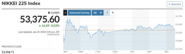 마켓워치에 따르면 일본 증시 대표 지수인 닛케이225지수(닛케이)는 전 거래일 대비 16.89엔(0.03%) 오르는 데 그쳐 5만3375.60에 마감했다. 급락 출발한 토픽스는 오후 들어 급등한 반면, 마감을 앞두고 보합권에 머물렀다. 종가는 전 거래일 대비 9.81포인트(0.28%) 오른 3545.30으로 마감했다.