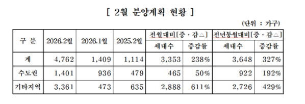 대한주택건설협회는 회원사를 대상으로 2월 주택분양계획을 집계한 결과 8개사가 7개 사업장에서 총 4762가구를 공급하는 것으로 파악됐다고 30일 밝혔다. 전월 1409가구 대비 3353가구 증가한 수치다. 특히 전년 동월 1114가구 대비 3648세대 증가했다.