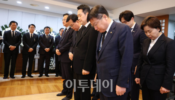 장동혁 국민의힘 대표와 송언석 원내대표 등 지도부가 30일 서울 종로구 서울대병원 장례식장에 마련된 고(故) 이해찬 전 국무총리의 빈소를 찾아 조문하고 있다. 사진공동취재단