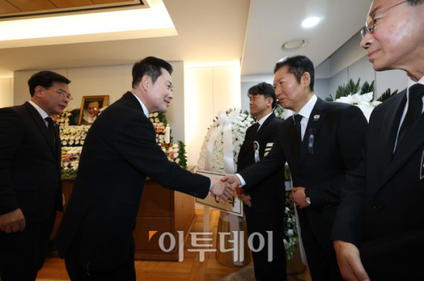 ▲장동혁 국민의힘 장동혁 대표(왼쪽 둘째)가 30일 오전 서울 종로구 서울대학교병원 장례식장에 마련된 故 이해찬 전 국무총리의 빈소를 찾아 조문한 뒤 정청래 더불어민주당 대표와 대화하고 있다. 2026.01.30. 사진공동취재단
