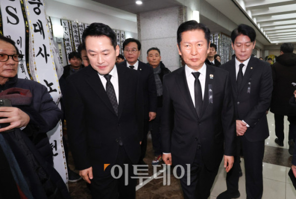 ▲장동혁 국민의힘 장동혁 대표(왼쪽)가 30일 오전 서울 종로구 서울대학교병원 장례식장에 마련된 故 이해찬 전 국무총리의 빈소를 찾아 조문한 뒤 정청래 더불어민주당 대표와 대화하고 있다. 2026.01.30. 사진공동취재단