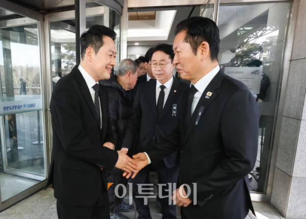 ▲장동혁 국민의힘 장동혁 대표(오른쪽)가 30일 오전 서울 종로구 서울대학교병원 장례식장에 마련된 故 이해찬 전 국무총리의 빈소를 찾아 조문한 뒤 정청래 더불어민주당 대표와 대화하고 있다. 2026.01.30. 사진공동취재단