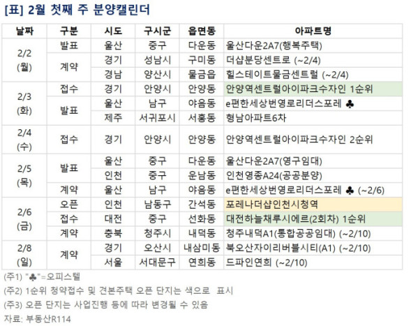 ▲2월 첫째 주 예정된 분양 관련 일정. (부동산R114)
