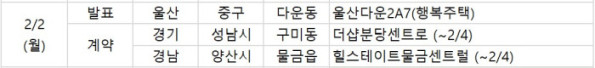 부동산 정보업체 부동산R114에 따르면 2일 오늘부터 4일까지 경기 성남시 '더샵분당센트로'와 경남 양산시 '힐스테이트물금센트럴' 단지에서 정당계약을 실시한다. 울산 중구 '울산다운2A7(행복주택)' 단지는 이날 당첨자를 발표한다.